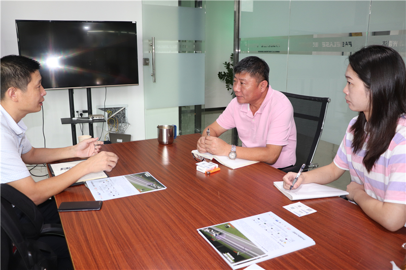 518智能装备在线记者与砝石董事长蒋伟先生(右二)及市场经理徐微(右一)进行交流